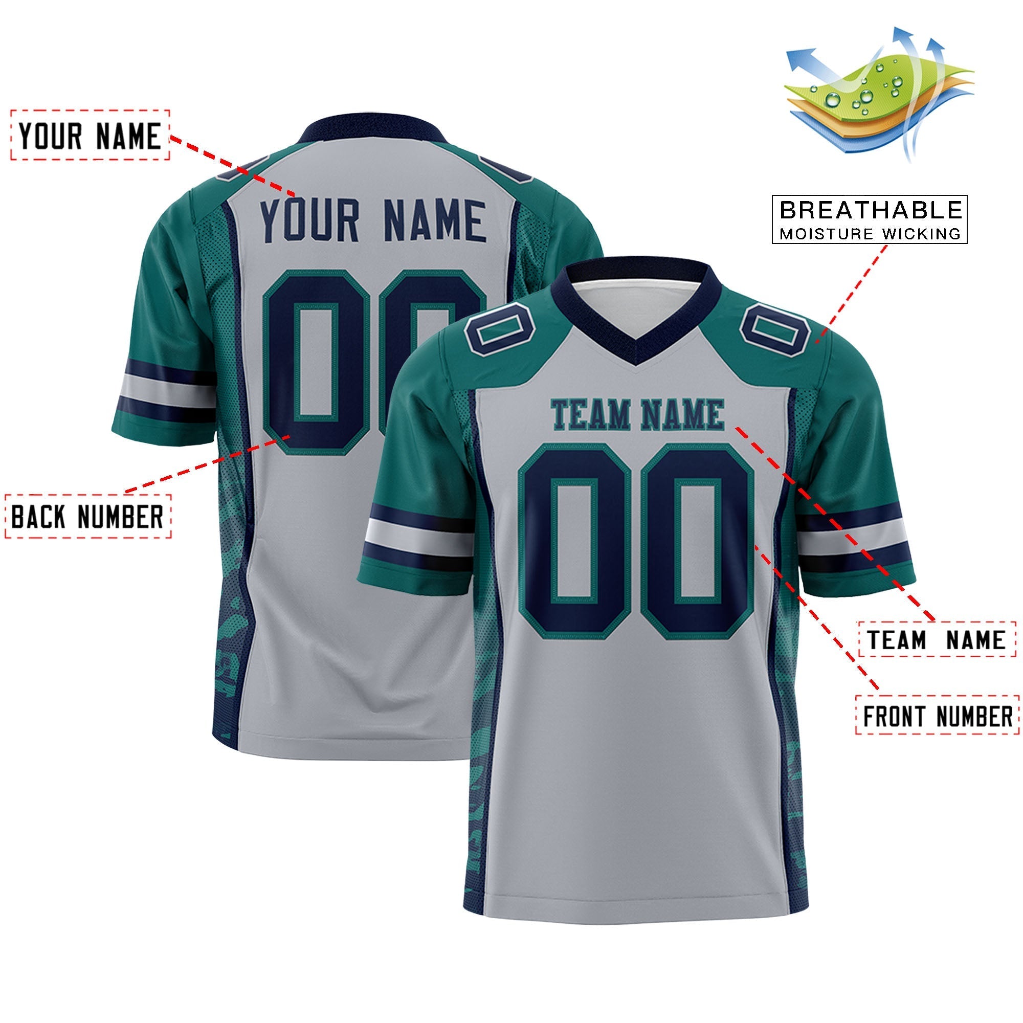 Custom Gray Aqua-Navy Raglan Sleeves Personalized Side Pattern Authentic Football Jersey