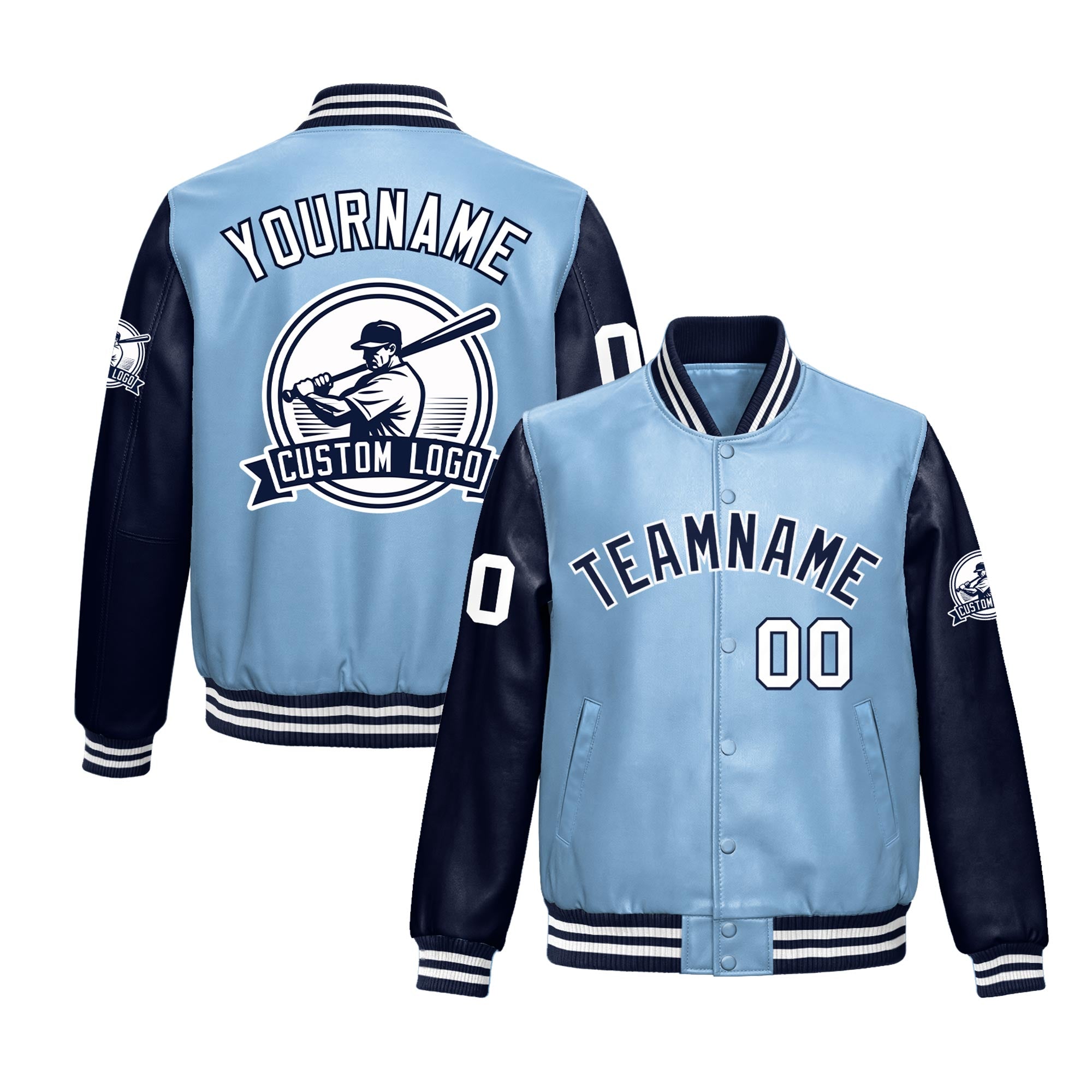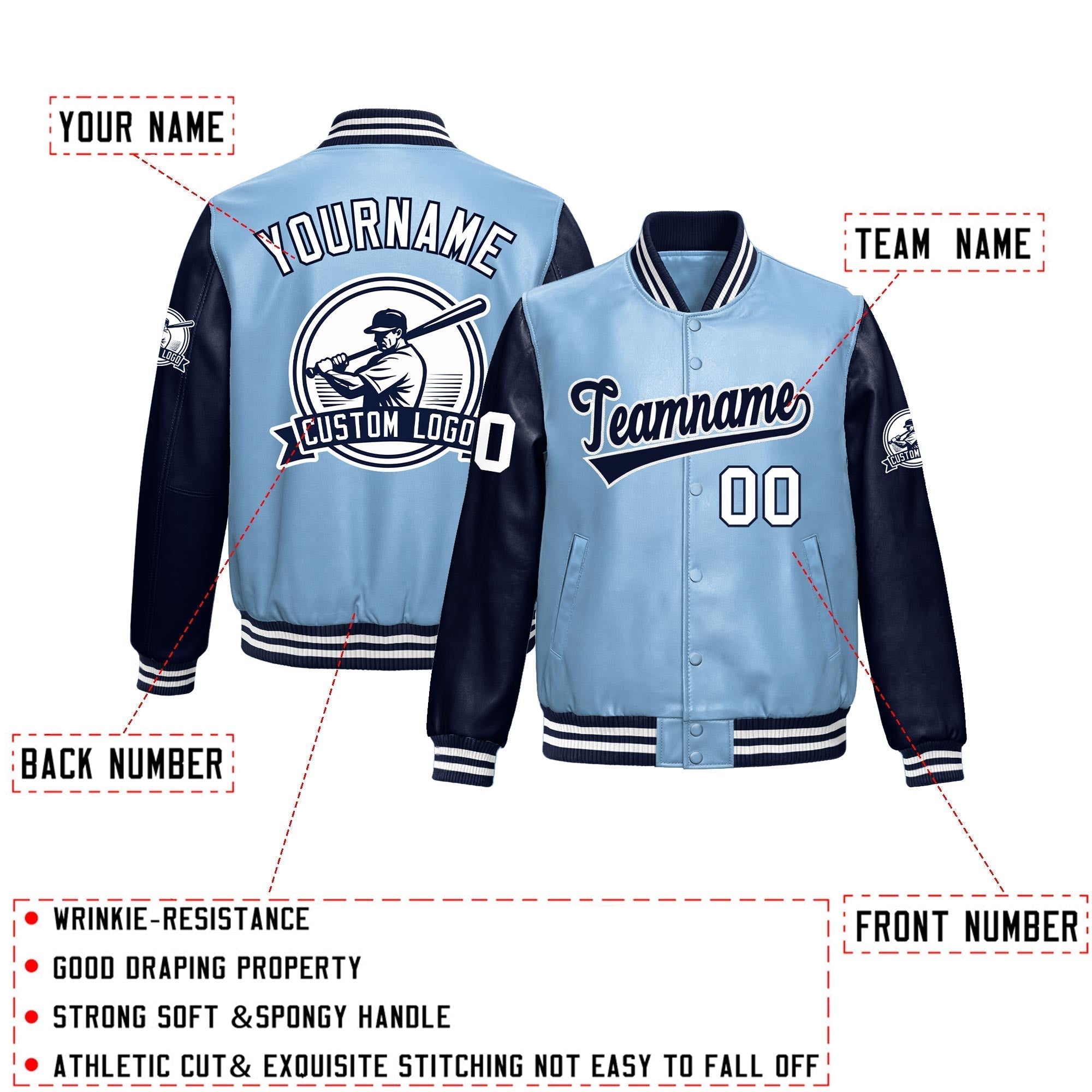 Premium faux leather sleeves varsity jacket with an athletic cut and exquisite stitching. Wrinkle-resistant, durable, and featuring a classic front pocket for a sharp, lasting look.
