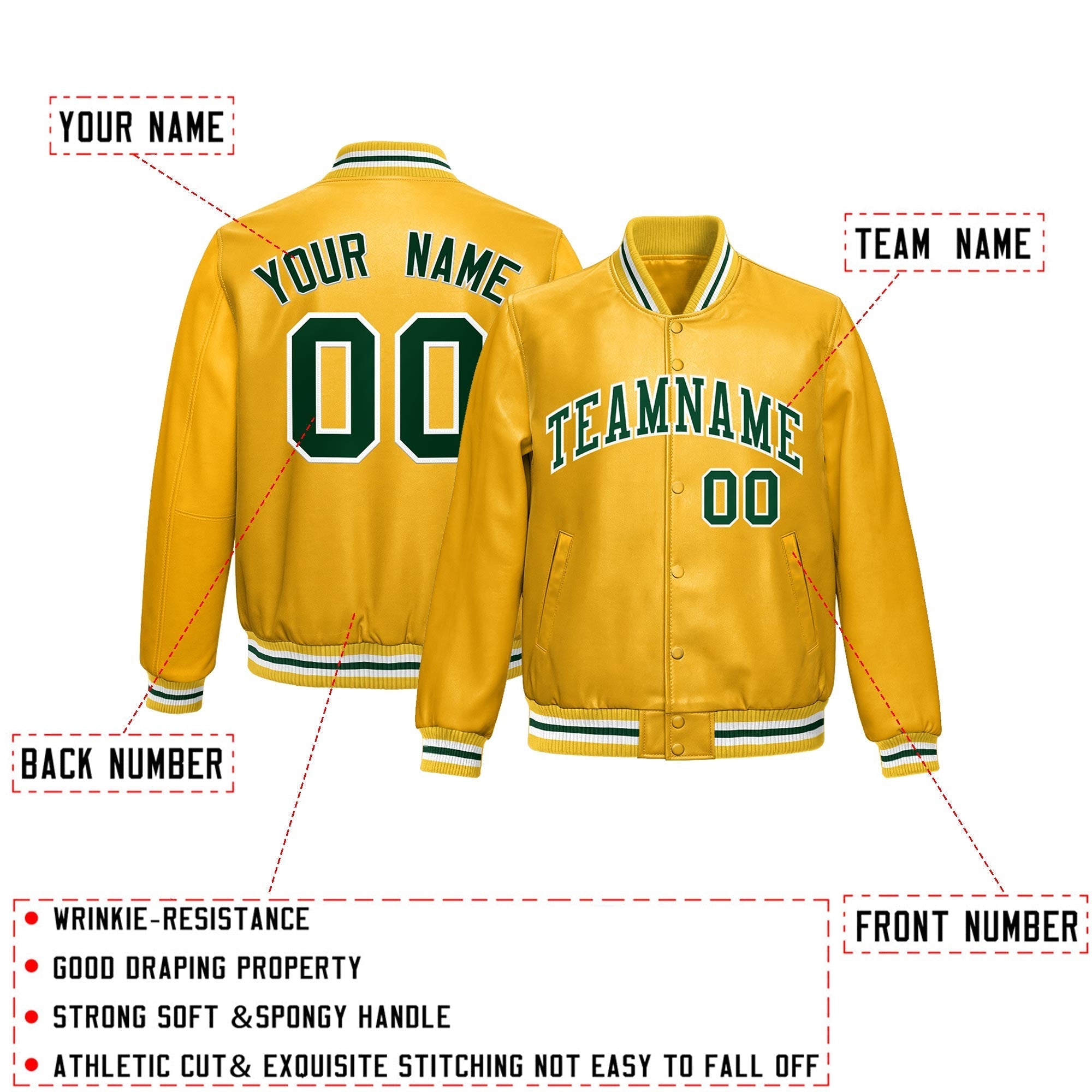 Premium faux leather varsity jacket with an athletic cut and exquisite stitching. Wrinkle-resistant, durable, and featuring a classic front pocket for a sharp, lasting look.
