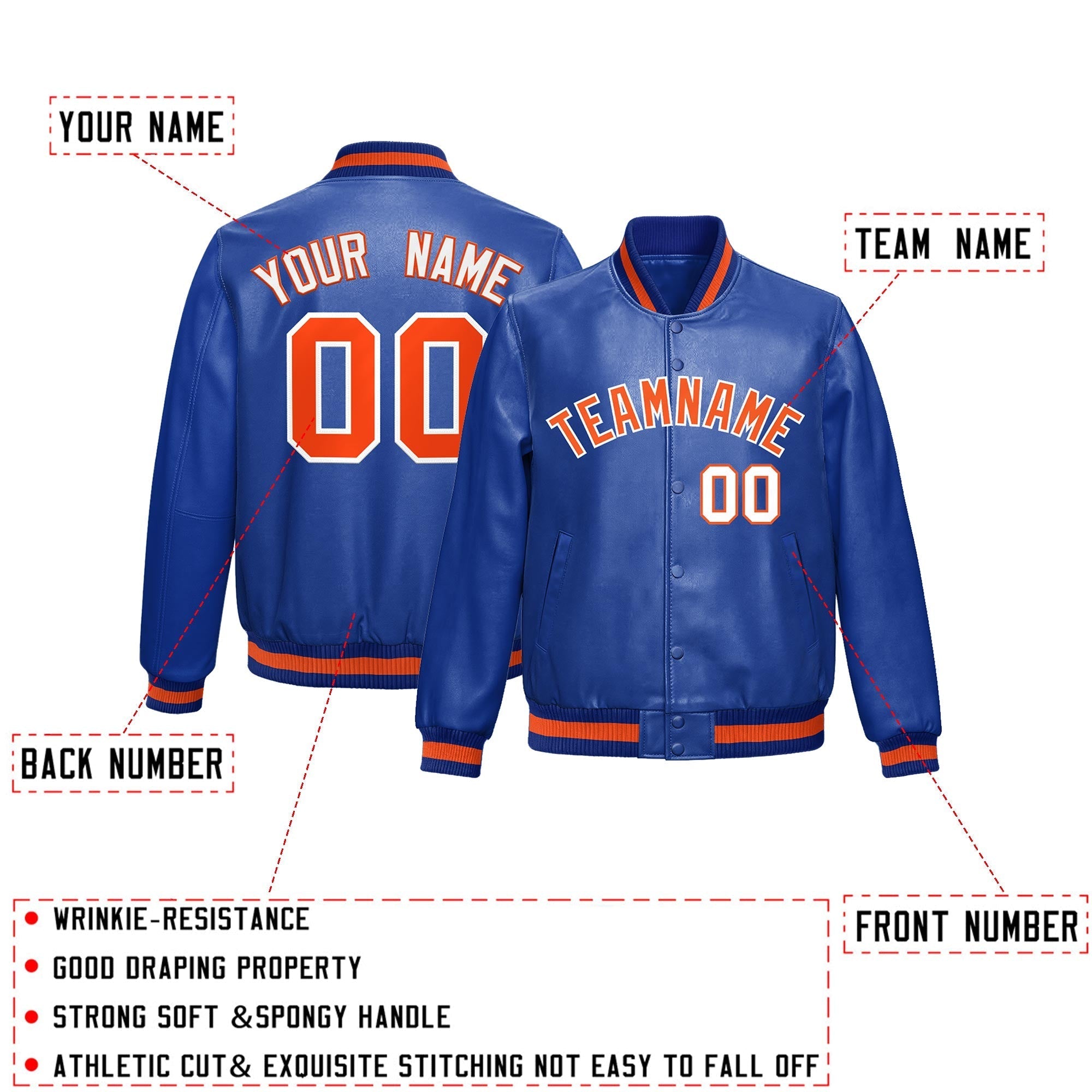 Premium faux leather varsity jacket with an athletic cut and exquisite stitching. Wrinkle-resistant, durable, and featuring a classic front pocket for a sharp, lasting look.