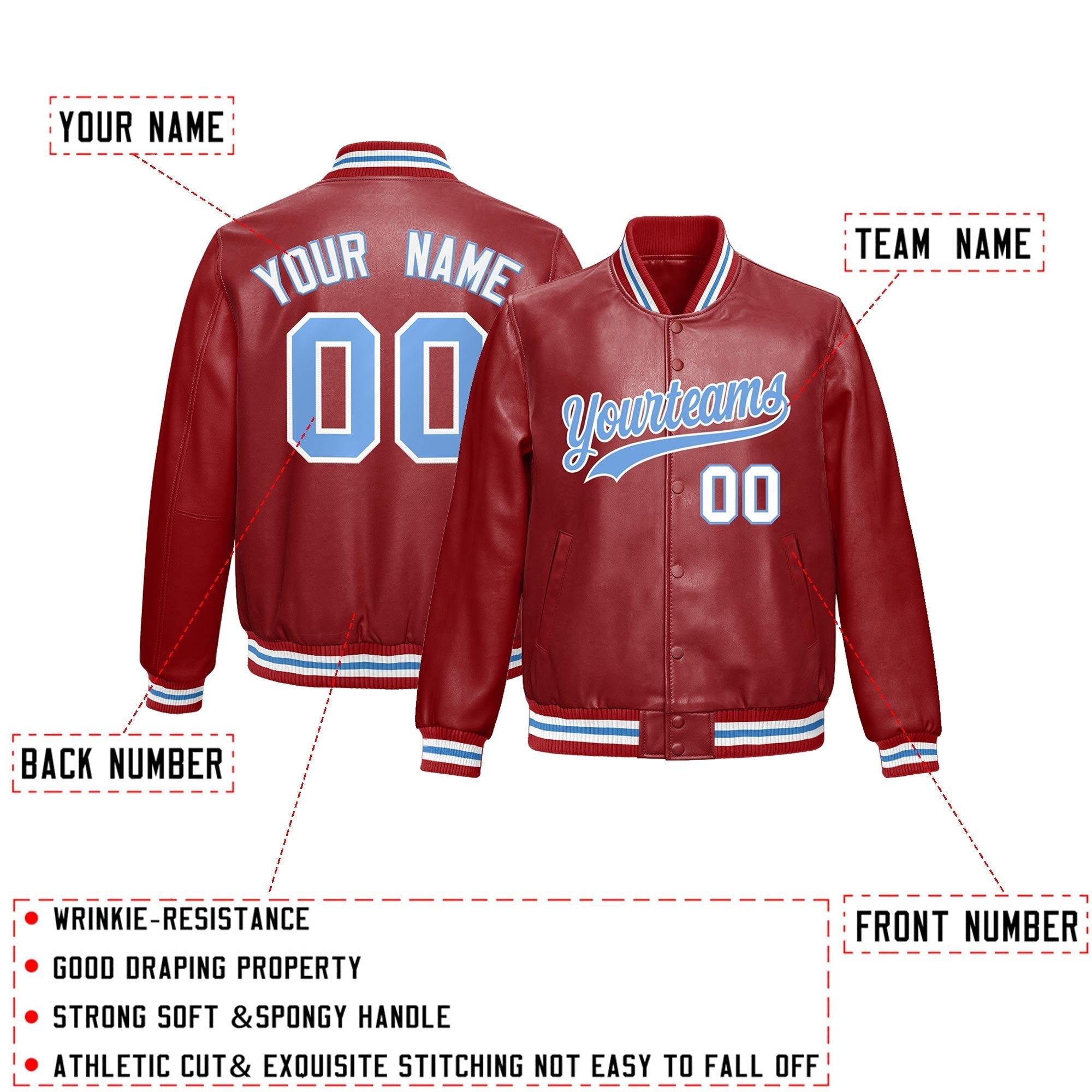 Premium faux leather varsity jacket with an athletic cut and exquisite stitching. Wrinkle-resistant, durable, and featuring a classic front pocket for a sharp, lasting look.